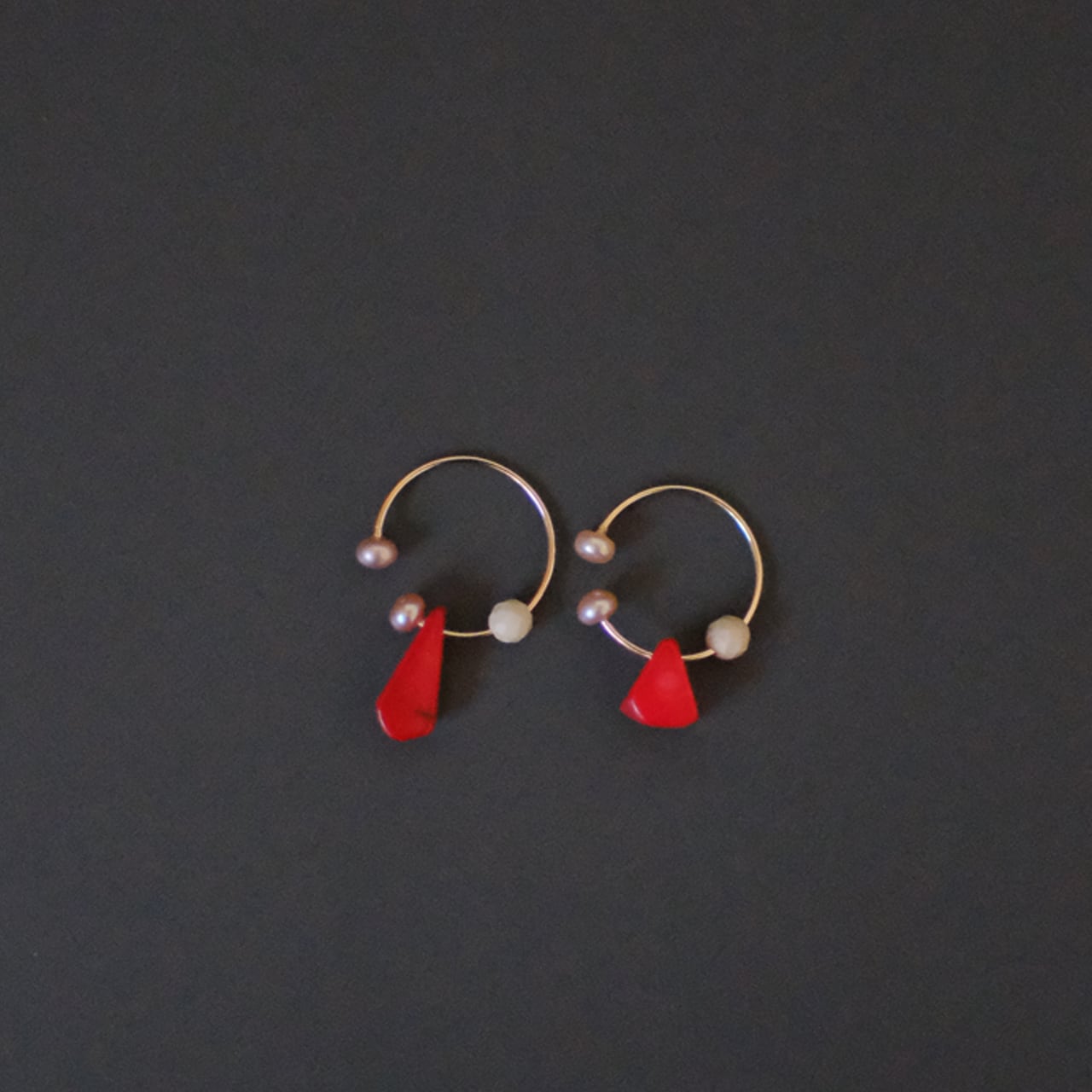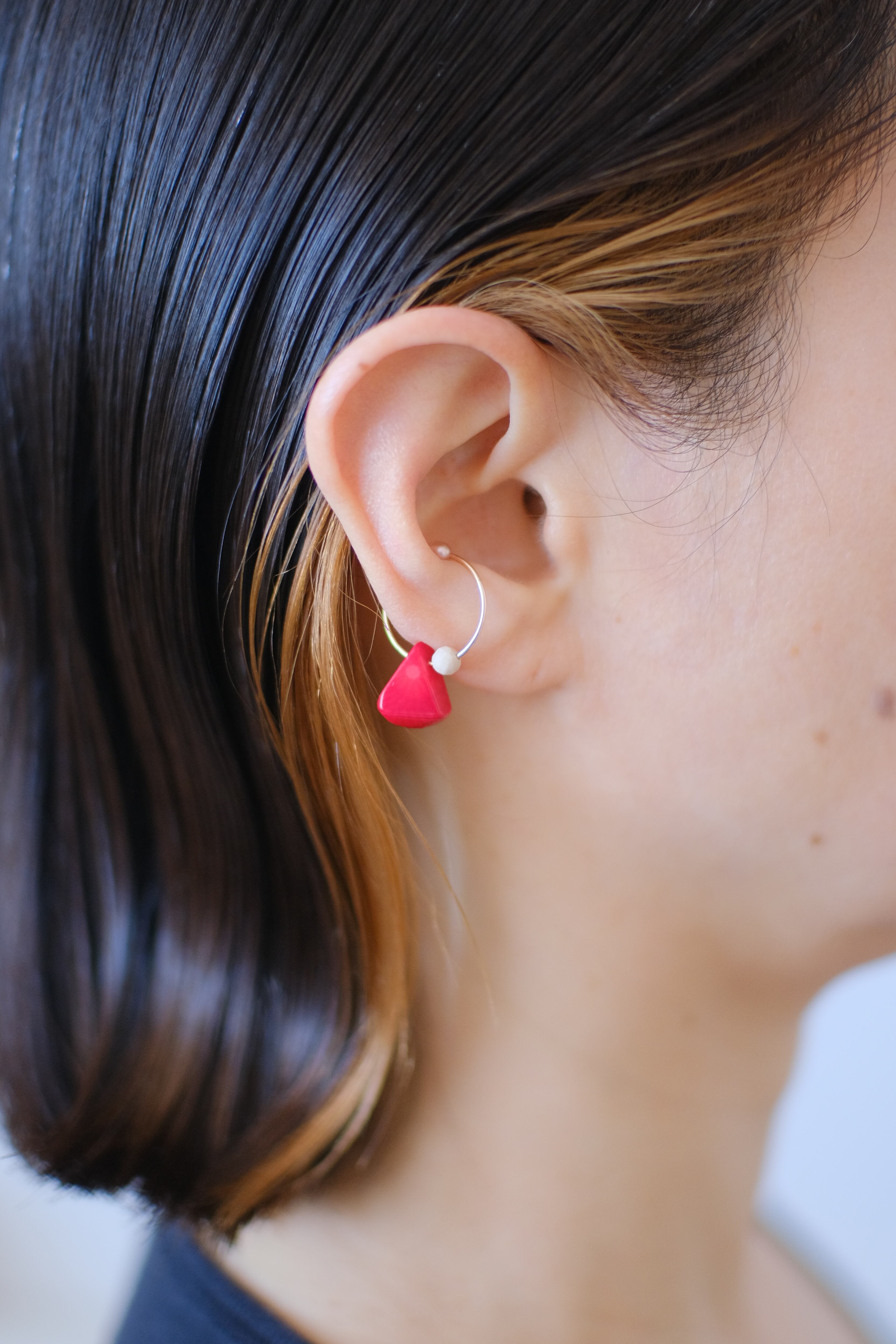 赤がとても印象的なシンプルイヤーカフ。一見すると派手に見えますが、肌馴染みはとても良く、お顔周りのアクセントになります。