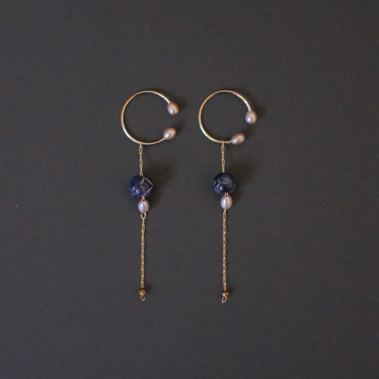 夜が明ける前の深く濃いの空のような紺色のアベンチュリンと、淡い小粒のパールのとても華奢で軽い揺れるイヤーカフです。